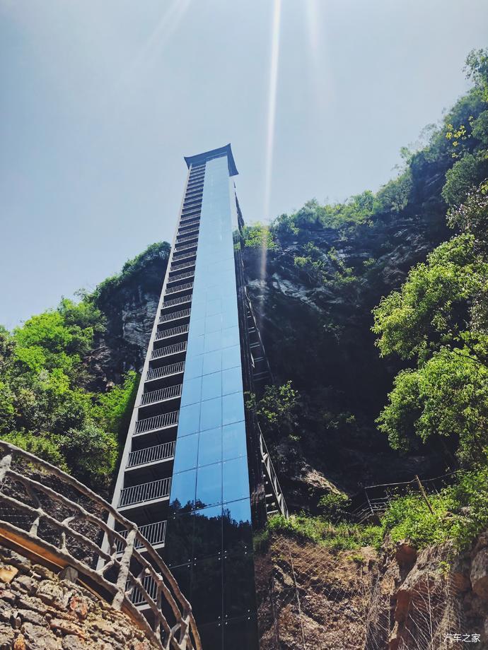 游玩推荐——垂直天梯直达云巅的挂壁观光天梯,垂直高度高达98米,相当于35层楼的高度,运行速度2米/秒,坐在里面瞬间从地心到达山顶,从不一样的视觉感受了地心谷的风景。